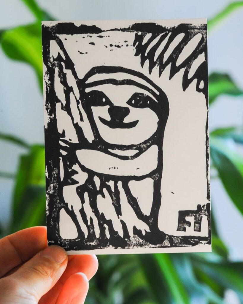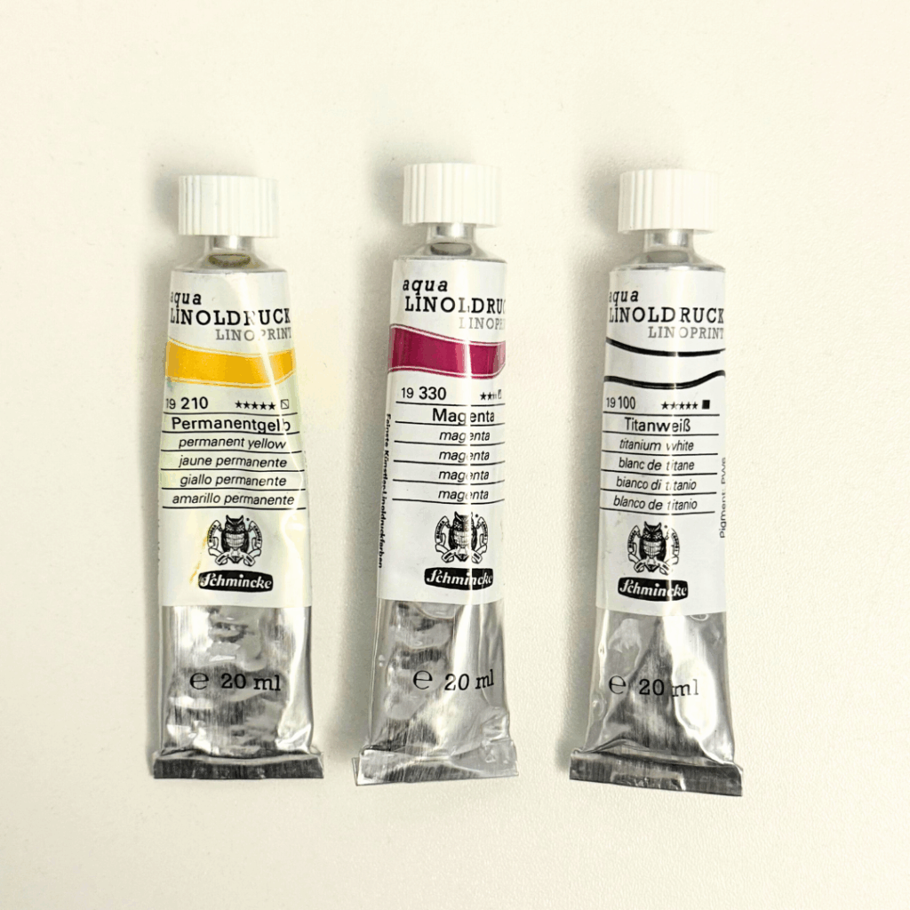 Für den Anfang empfehlen wir dir Aqua Linoldruckfarbe. Diese ist wasserlöslich und kann nach dem Drucken leicht vom Werkzeug entfernt werden. Druckerschwärze und Öldruckfarben können nur mit Terpentin entfernt werden. Sie trocknen zudem langsamer.